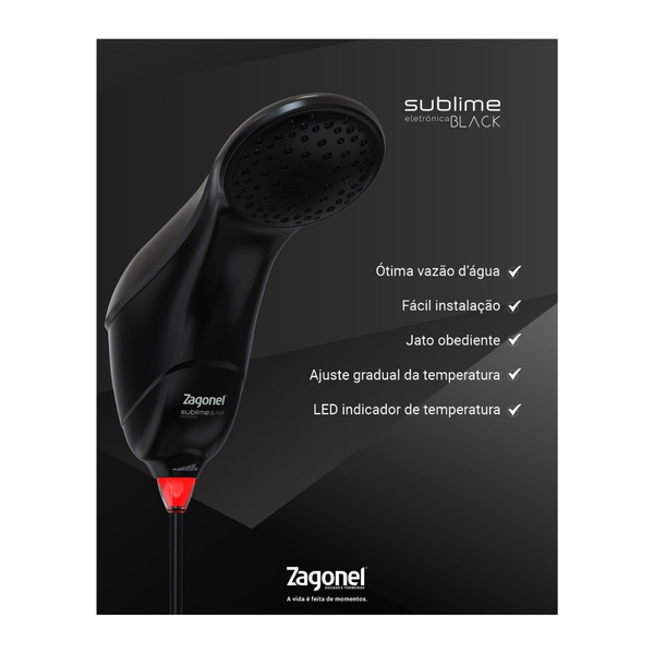 Chuveiro zagonel sublime eletrônico preto 127v – a inovação que você merece! a ducha eletrônica sublime foi desenvolvida para tornar cada banho um experiência com sofisticação, qualidade e segurança para toda a família. o sistema de regulagem a distância com controle de temperatura eletrônico permite um ajuste preciso, adequando a temperatura ideal para o banho de toda a família! características técnicas: sistema microprocessado; potência com variação progressiva e linear de temperatura; indicador luminoso de temperatura com led; troca de temperatura a distância; facilidade na instalação: sistema de engate rápido. acompanha o produto: 1 ducha sublime eletrônica 1 haste de comando 1 mangueira com ducha manual 1 manual de instalação 1 redutor de pressão